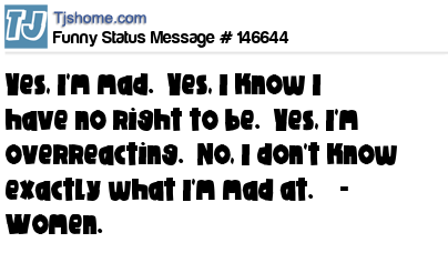 X says Yes, I'm mad. Yes, I know I have no right to be. Yes, I'm overreacting. No, I don't know exactly what I'm mad at. - Women.