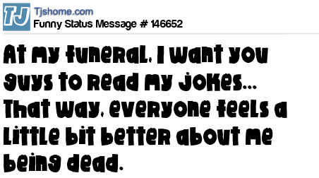 X At my funeral, I want you guys to read my jokes... That way, everyone feels a little bit better about me being dead.