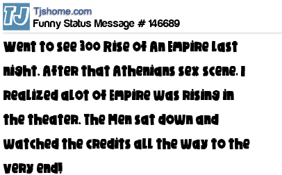 X  Went to see 300 Rise of An Empire last night. After that Athenians sex scene, I realized alot of Empire was rising in the theater. The Men sat down and watched the credits all the way to the very end!