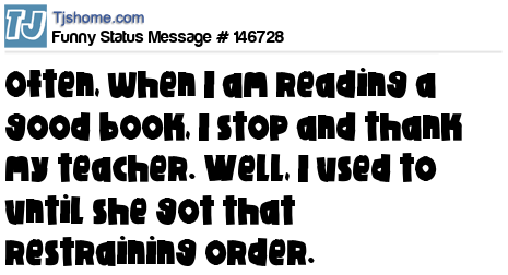 X says Often, when I am reading a good book, I stop and thank my teacher. Well, I used to until she got that restraining order.