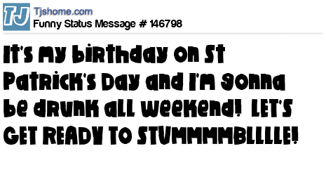 X says It's my birthday on St Patrick's Day and I'm gonna be drunk all weekend! LET'S GET READY TO STUMMMMBLLLLE!