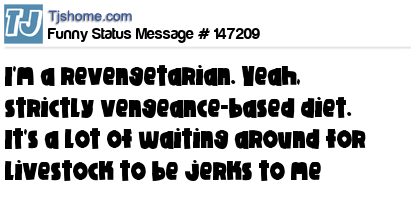 X says I'm a revengetarian. Yeah, strictly vengeance-based diet. It's a lot of waiting around for livestock to be jerks to me