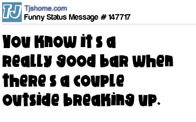 X says You know it’s a really good bar when there’s a couple outside breaking up.