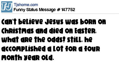 X can't believe Jesus was born on Christmas and died on Easter, what are the odds? still, he accomplished a lot for a four month year old.