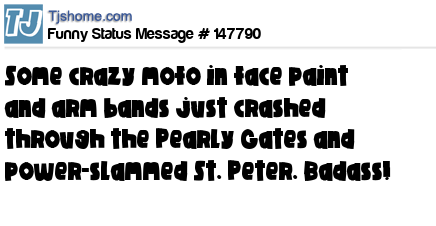 X Some crazy mofo in face paint and arm bands just crashed through the Pearly Gates and power-slammed St. Peter. Badass!