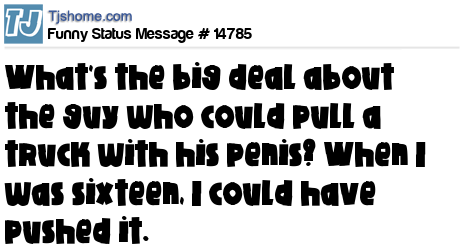 X is What's the big deal about the guy who could pull a truck with his penis? When I was sixteen, I could have pushed it.