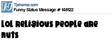 - # 151301 Don't religious people have the same said "blog" where they can be stupid without boring the rest of US? How "Christian" to talk crap about others...religious people are some of the BIGGEST hypocrites and most judgmental people I know of.