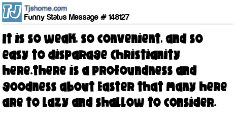 X says It is so weak, so convenient, and so easy to disparage Christianity here.there is a profoundness and goodness about Easter that many here are to lazy and shallow to consider.