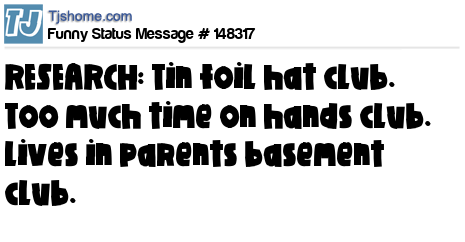 X says RESEARCH: Tin foil hat club. Too much time on hands club. Lives in parents basement club.