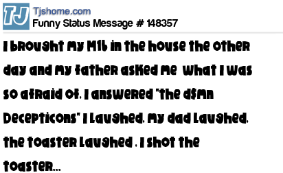 X says I brought my M16 in the house the other day and my father asked me what I was so afraid of, I answered "the d$mn Decepticons" I laughed, my dad laughed, the toaster laughed , I shot the toaster...