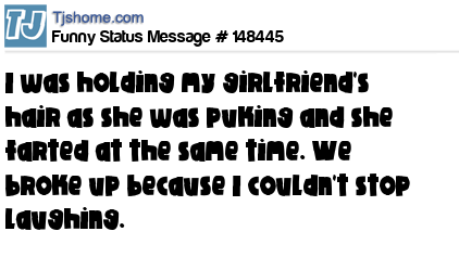 X says I was holding my girlfriend's hair as she was puking and she farted at the same time. We broke up because I couldn't stop laughing.