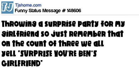 - # 153076 Throwing a surprise party for my girlfriend so just remember that on the count of three we all yell "SURPRISE YOU'RE NOW JOHN'S GIRLFRIEND"