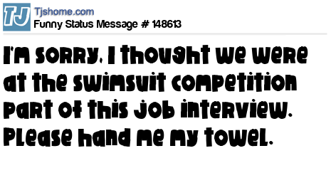 X says I'm sorry, I thought we were at the swimsuit competition part of this job interview. Please hand me my towel.