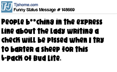 X says People b**ching in the express line about the lady writing a check will be p!ssed when I try to barter a sheep for this 6-pack of Bud Lite.