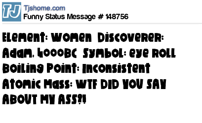 X says Element: Women Discoverer: Adam, 4000BC Symbol: eye roll Boiling Point: Inconsistent Atomic Mass: WTF DID YOU SAY ABOUT MY ASS?!