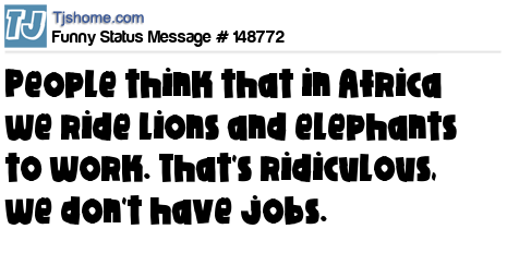X says People think that in Africa we ride lions and elephants to work. That's ridiculous, we don't have jobs.