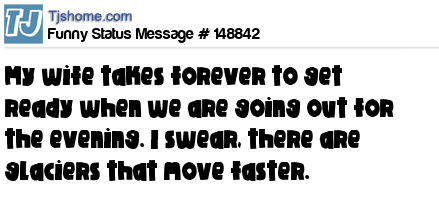 X says My wife takes forever to get ready when we are going out for the evening. I swear, there are glaciers that move faster.
