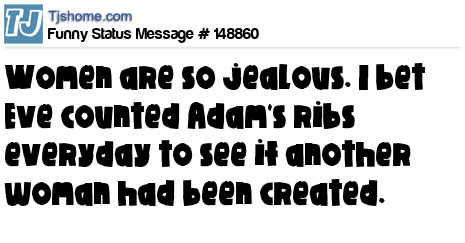 X says Women are so jealous. I bet Eve counted Adam's ribs everyday to see if another woman had been created.