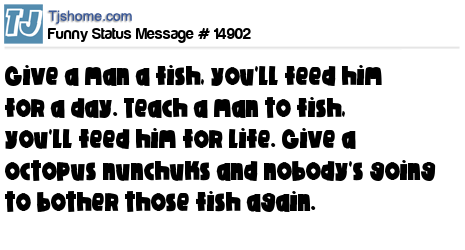 - # 100671 Give a man a fish, he'll eat for a day. Teach a man to fish, he'll eat for life. Give an octopus nunchuks, no one's eating fish ever again