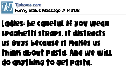 X says Ladies: be careful if you wear spaghetti straps. It distracts us guys because it makes us think about pasta. And we will do anything to get pasta.