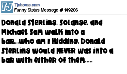 X Donald Sterling, Solange, and Michael Sam walk into a bar,,,,who am I kidding, Donald Sterling would NEVER was into a bar with either of them.....