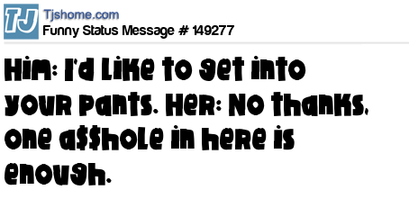 X says Him: I'd like to get into your pants. Her: No thanks, one a$$hole in here is enough.