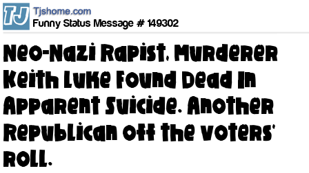 X says Neo-Nazi Rapist, Murderer Keith Luke Found Dead In Apparent Suicide. Another Republican off the voters' roll.