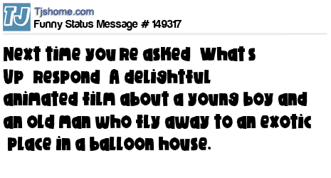 X says Next time you’re asked “What’s Up” respond “A delightful animated film about a young boy and an old man who fly away to an exotic  place in a balloon house.”