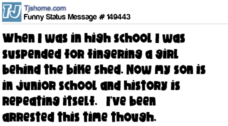 X says When I was in high school I was suspended for fingering a girl behind the bike shed. Now my son is in junior school and history is repeating itself. I've been arrested this time though.