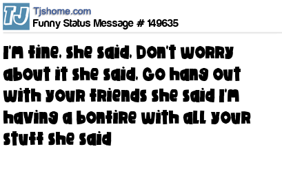 X says I'm fine, she said, Don't worry about it she said, Go hang out with your friends she said I'm having a bonfire with all your stuff she said