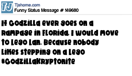 X If Godzilla ever goes on a rampage in Florida, I would move to Lego Lan. Because nobody likes stepping on a Lego #GodzillaKryptonite