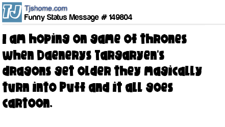 X says I am hoping on game of thrones when Daenerys Targaryen's dragons get older they magically turn into Puff and it all goes cartoon.