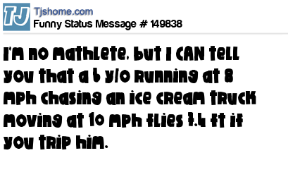 X says I'm no mathlete, but I CAN tell you that a 6 y/o running at 8 mph chasing an ice cream truck moving at 10 mph flies 7.4 ft if you trip him.
