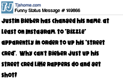 - # 149865 Justin Beiber's publicist reports that Justinwant to change his name to "Bizzle" to increase his street cred. However music industry insiders say his new name will more than likely be "Justinutha Lonelynizzle"