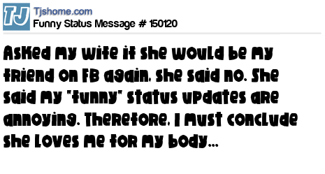 X says Asked my wife if she would be my friend on FB again, she said no. She said my "funny" status updates are annoying. Therefore, I must conclude she loves me for my body...