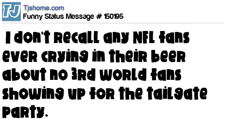 X says I don't recall any NFL fans ever crying in their beer about no 3rd world fans showing up for the tailgate party.