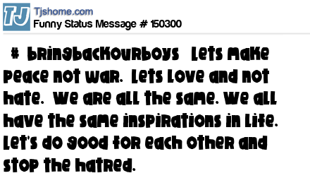 X #bringbackourboys Lets make peace not war. Lets love and not hate. We are all the same. We all have the same inspirations in life. Let's do good for each other and stop the hatred.