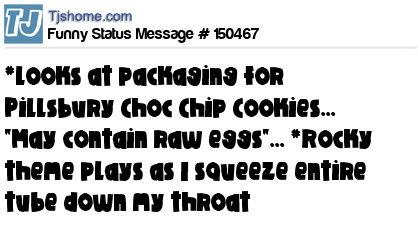 X  *looks at packaging for Pillsbury Choc Chip Cookies... "May contain raw eggs"... *Rocky theme plays as I squeeze entire tube down my throat