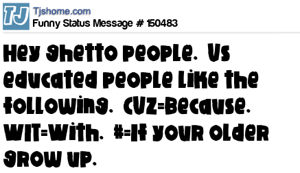 X says Hey ghetto people. Us educated people like the following. CUZ=Because. WIT=With. #=If your older grow up.