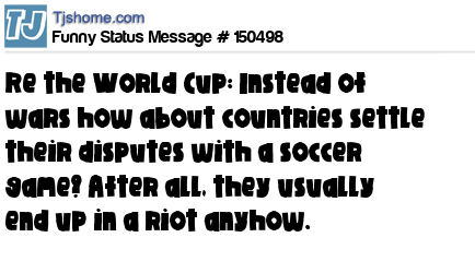 X says Re the World Cup: Instead of wars how about countries settle their disputes with a soccer game? After all, they usually end up in a riot anyhow.