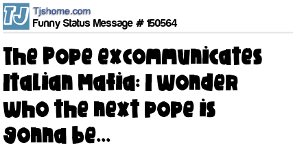 - # 150584 I love this new Pope...He is so different! I dont even think he's not even Christian. He excommunicated Italian Mafias on Mafia war. He's like Go to chruch...or nah! hashtag whateves!