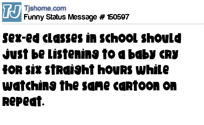 - # 150701 Sex-ed classes in school should just be listening to a baby cry for six straight hours while watching the same cartoon on repeat........