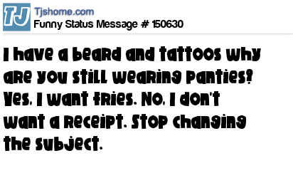 X says I have a beard and tattoos why are you still wearing panties? Yes, I want fries. No, I don't want a receipt. Stop changing the subject.