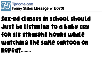 - # 150597 Sex-ed classes in school should just be listening to a baby cry for six straight hours while watching the same cartoon on repeat.