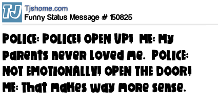 X says POLICE: POLICE! OPEN UP! ME: My parents never loved me. POLICE: NOT EMOTIONALLY! OPEN THE DOOR! ME: That makes way more sense.