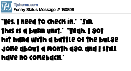 X says "Yes, I need to check in." "Sir, this is a burn unit." "Yeah, I got hit hard with a battle of the bulge joke about a month ago, and I still have no comeback."