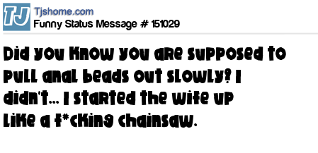 X says Did you know you are supposed to pull anal beads out slowly? I didn't... I started the wife up like a f*cking chainsaw.
