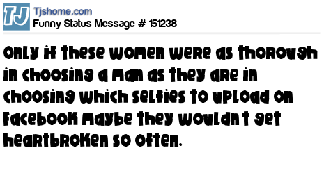 - # 151196 Only if these women were as thorough in choosing a man as they are in choosing which selfies to upload on facebook maybe they wouldn't get heartbroken so often.