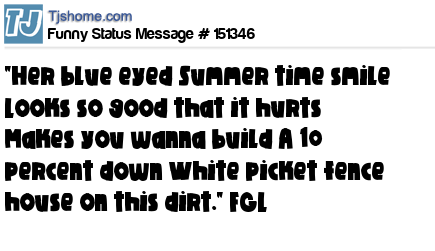X  "Her blue eyed Summer time smile Looks so good that it hurts Makes you wanna build A 10 percent down White picket fence house on this dirt." FGL