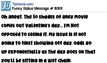 X says Oh great. The 50 shades of grey movie comes out Valentine's day... I'm Not opposed to seeing it, my issue is if not going to first showing off day, odds go up exponentially as the day goes on that you'll be sitting in a wet chair.